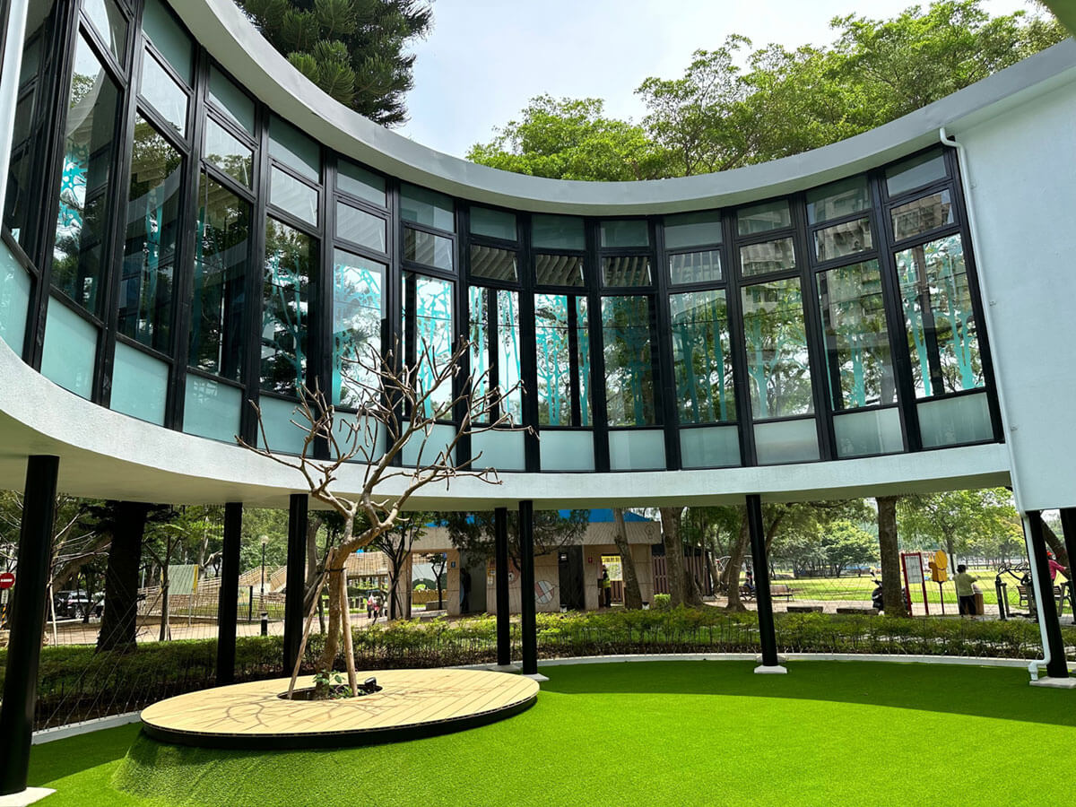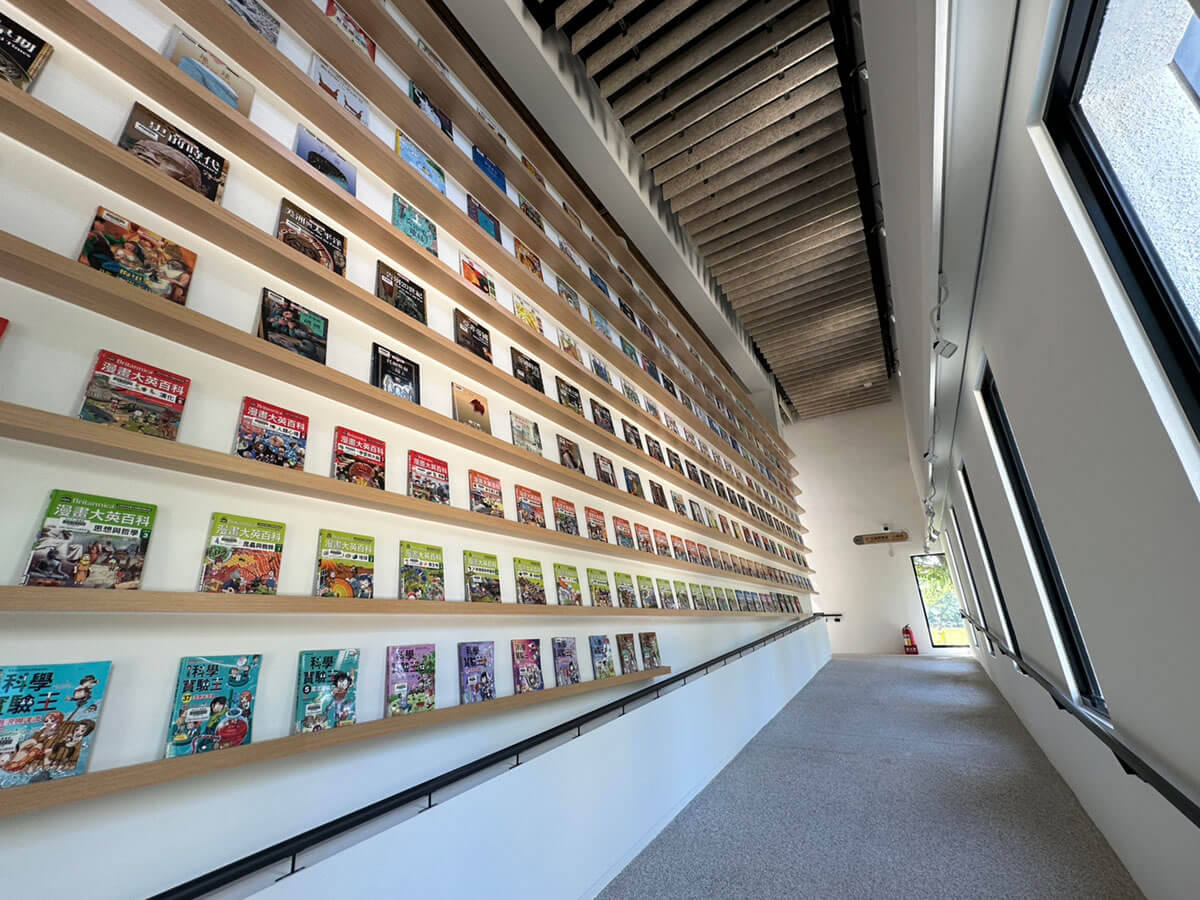 以坡道串聯樓層及室內外空間,挑高環景書牆結合在地藝術創作及書籍展示,打造空間美學新體驗。